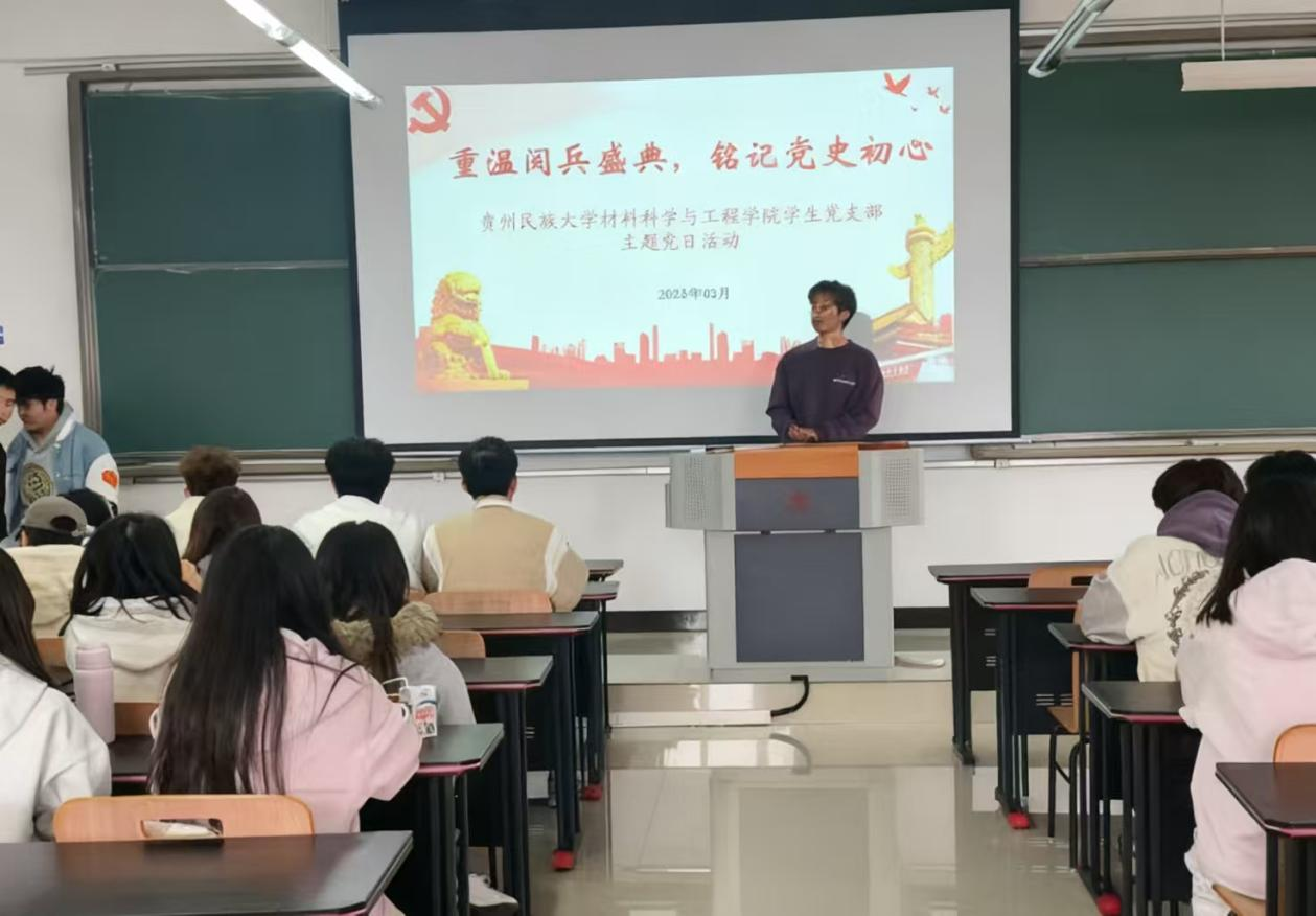 2025年9月19日,材料科学与工程学院学生党支部在贵州民族大学南校区第一教学楼C-222开展“重温阅兵盛典,铭记党史初心”主题党日活动