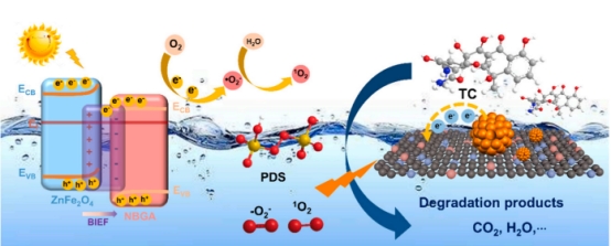 水体中新污染物(如抗生素)的持续增加对生态系统和人类健康构成严重威胁。光助类芬顿反应结合了光催化与过硫酸盐活化优势,其中铁基材料因成本低、可回收性高而备受关注。本研究针对金属离子溶出、电荷复合和催化稳定性等核心问题,提出在氮硼共掺杂石墨烯气凝胶(NBGA)上负载ZnFe₂O₄,通过Fe-X-C化学桥实现金属离子限域与直接电荷传输的协同强化机制。